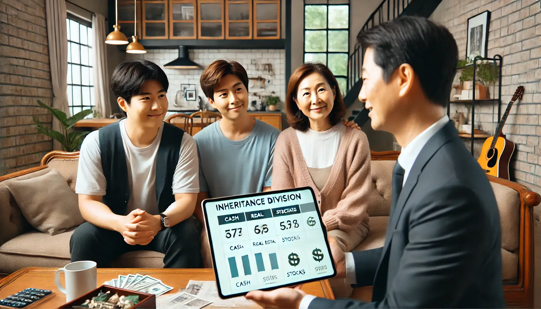 - 부모님 중 한 분(아버지)이 돌아가셨고, 남겨진 재산은 다음과 같습니다: