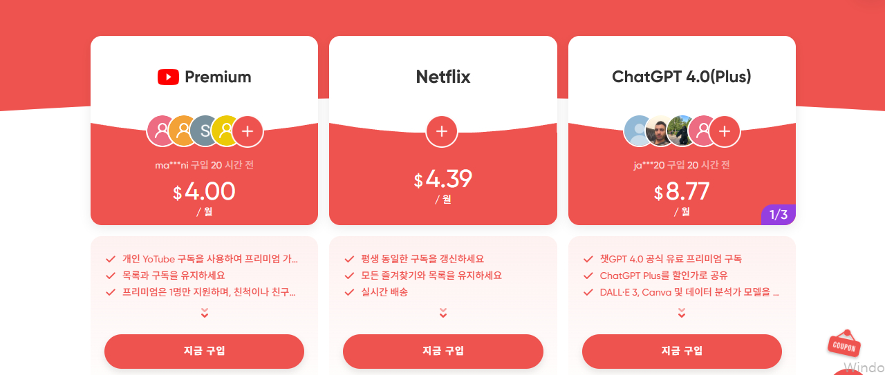 겜스고는 구독료를 절약할 수 있도록 여러 명이 프리미엄 서비스를 공유할 수 있게 해주는 플랫폼입니다. 이곳을 통해 ChatGPT 4.0을 구독할 경우, 일반 요금인 월 약 27,000원 대신 8,000원대의 저렴한 가격에 사용할 수 있습니다. 또한, 프로모션 코드를 적용하면 월 7,300원까지 할인받을 수 있어 더욱 경제적입니다.